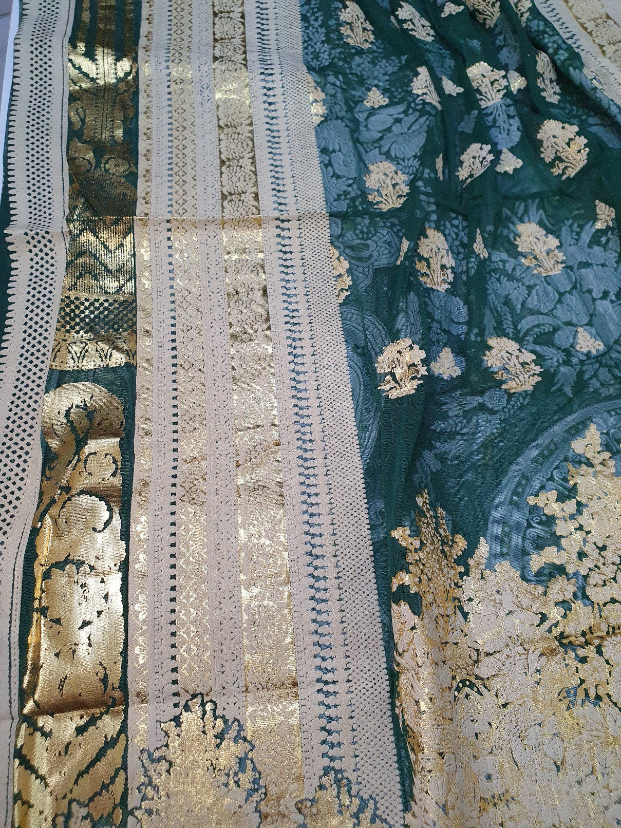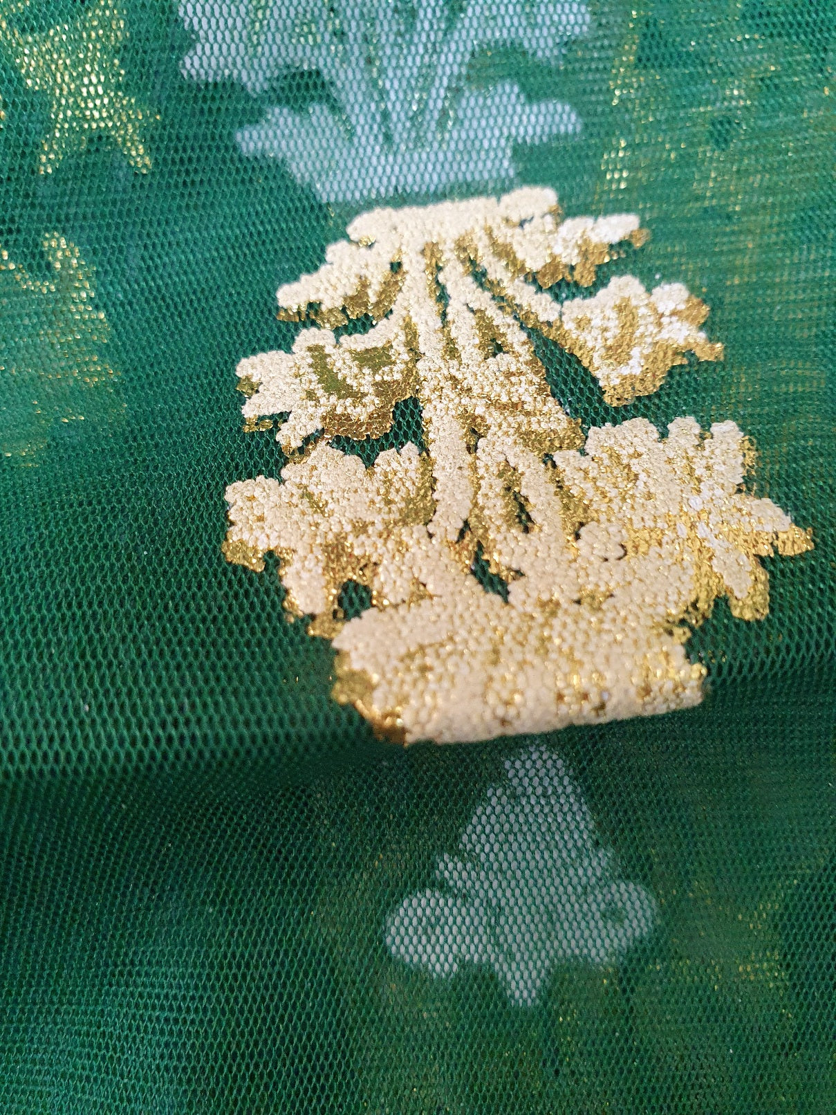 This J. Net Dupatta in green features intricate golden and beige paste prints on fine net fabric. Ready to wear, it blends traditional Pakistani elegance with formal sophistication for women.