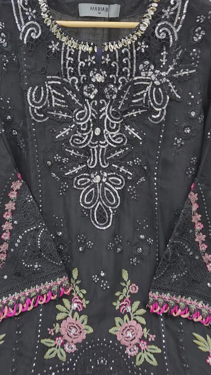 Elevate your presence in this Maria B-inspired 3-piece black chiffon suit, pre-stitched for instant wear. Exquisite embroidery, sequins, stones, and tassels create undeniable elegance for weddings and celebrations. Timeless sophistication, effortlessly achieved.