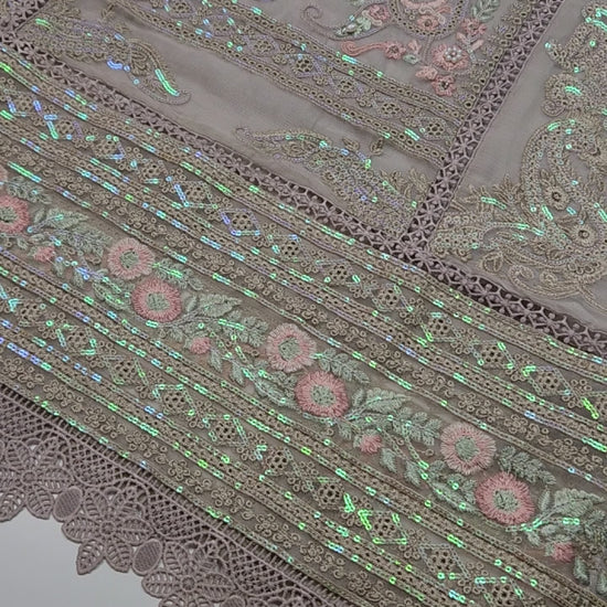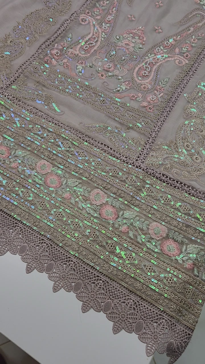 This Maria B-inspired 3-piece chiffon suit arrives pre-stitched and ready to wear. Adorned with embroidery, sequins, and pearls, it's perfect for weddings and celebrations. No tailoring needed—just elegance and comfort.